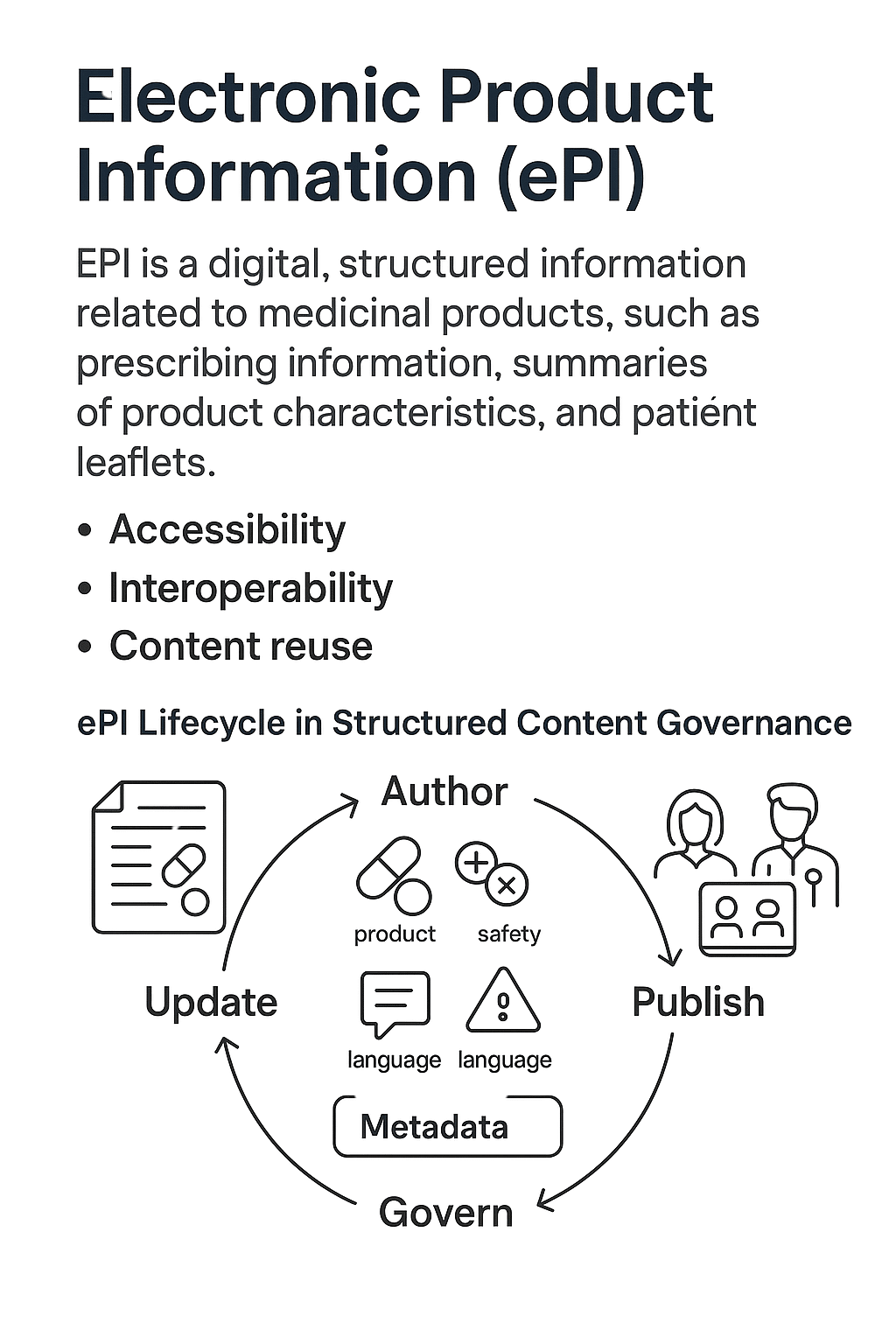 - Interoperability: ePI formats align with international standards (e.g., HL7 FHIR) for seamless exchange between regulatory, clinical, and commercial systems.